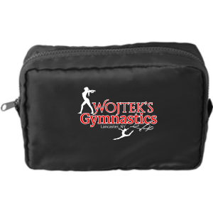 10.75″h x 20.75″w x 9″d, polyester canvas, fully lined, zippered main compartment, front pocket and separate zippered end pouch for pool gear or shoes, adjustable/detachable shoulder strap — embroidered with logo