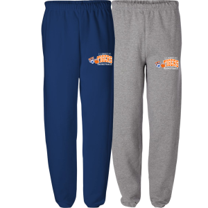 7.8 oz. 50/50 cotton/poly fleece, air jet yarn for softness, elastic waistband with drawcord, open bottom cuffs — embroidered logo left leg