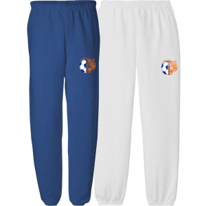 7.8 oz. 50/50 cotton/poly fleece, air jet yarn for softness, elastic waistband with drawcord, open bottom cuffs — embroidered logo left leg