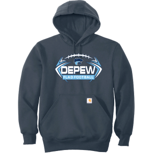 13 oz. 55/45 cotton/poly blend with Rain Defender durable water-repellent finish, attached jersey-lined three-piece hood with drawcord closure, front hand warmer pocket with hidden security pocket inside, stretchable, spandex-reinforced, rib knit cuffs and waistband, Carhartt label sewn on hand warmer pocket, loose fit — embroidered logo left chest