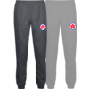 8 oz. 50/50 cotton/polyester pill resistant fleece, pre-shrunk, elastic bottom leg openings — imprinted logo left leg
