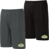 3-1/2 inch inseam, 100% polyester micropoly shell, 100% polyester mesh inserts, 100% polyester wicking crepe lining, liner wicks moisture, low rise, covered elastic waistband with inside drawcord, inner brief with leg elastic, inside key pocket — imprinted logo left leg
